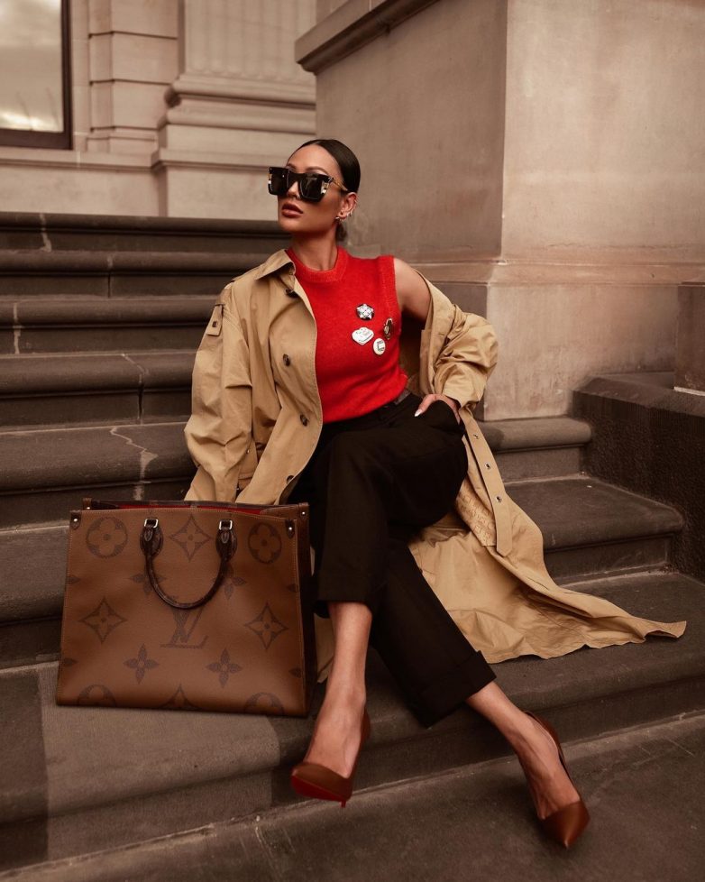 В качестве правильного аксессуара следует выбрать сумку-конверт, деловой портфель или небольшую сумку с короткими двумя ручками из кожи.