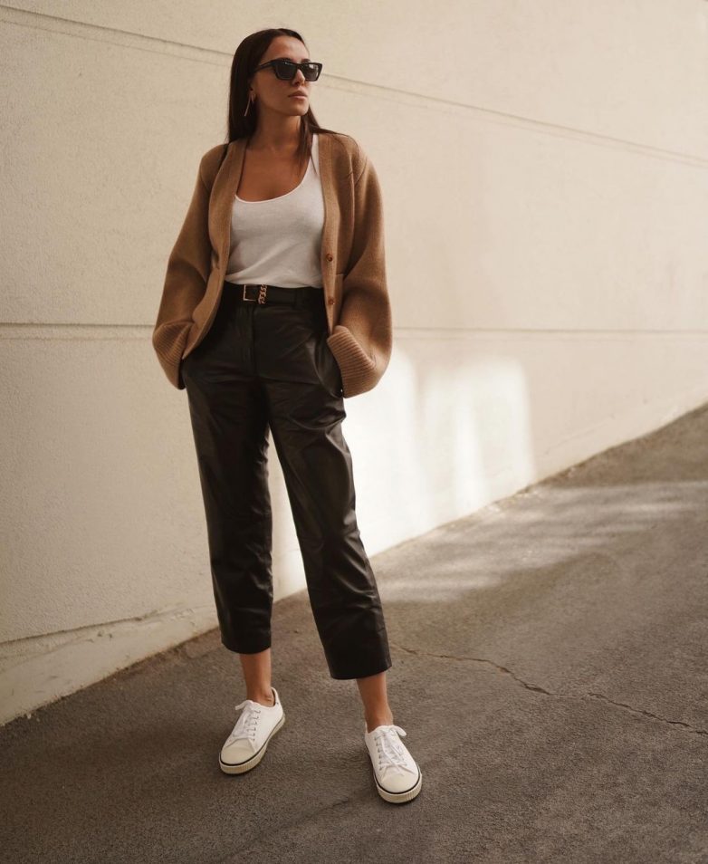 В узких черных брюках и объемном свитере уместно отправиться на занятия в университет, на прогулку с друзьями. Из обуви к такому наряду подойдут ботильоны, ботинки, лоферы, сапоги на плоской подошве.