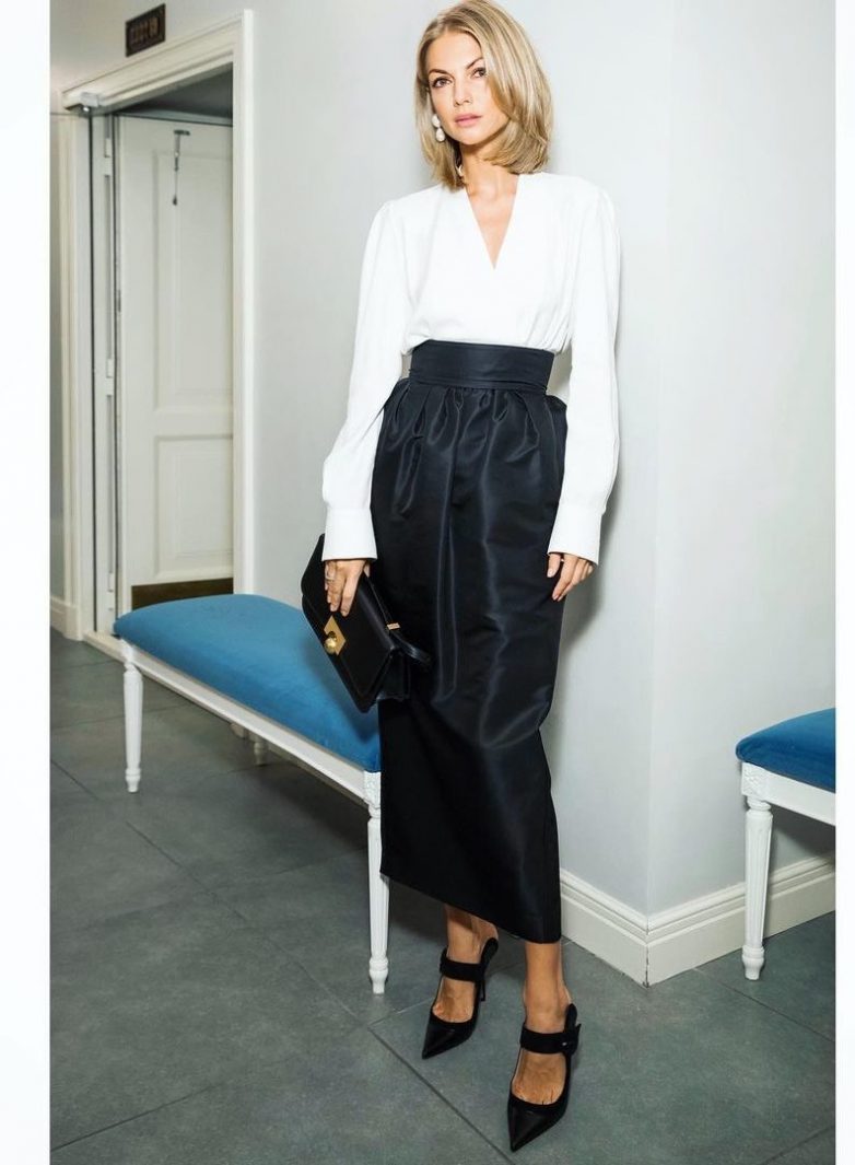 Юбка-тюльпан длины миди сможет создать женственный образ в деловом стиле. К наряду вы можете выбрать совершенно любой верх, который разрешен в строгом дресс-коде. Так как фасон юбки разграничивает фигуру, подбирайте к ней шпильки или лодочки.