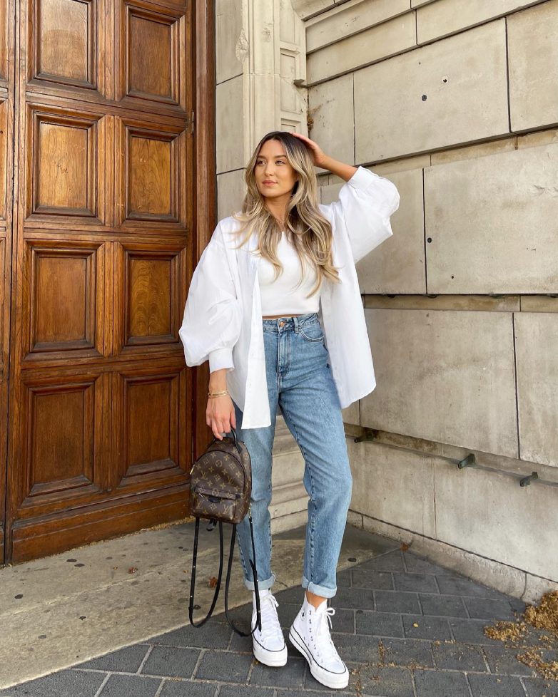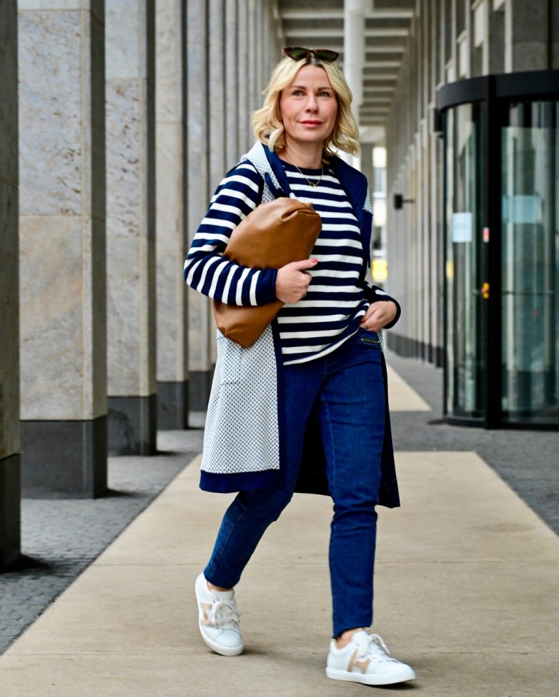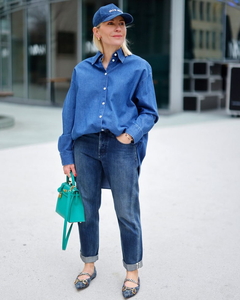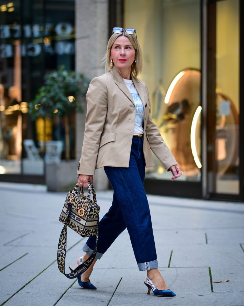 Джинсы прямого кроя без узоров никогда не выйдут из моды. Они универсальные. Цветовая гамма вещей должна быть гармоничной. Чтобы выглядеть моложе, образ следует завершить кроссовками.