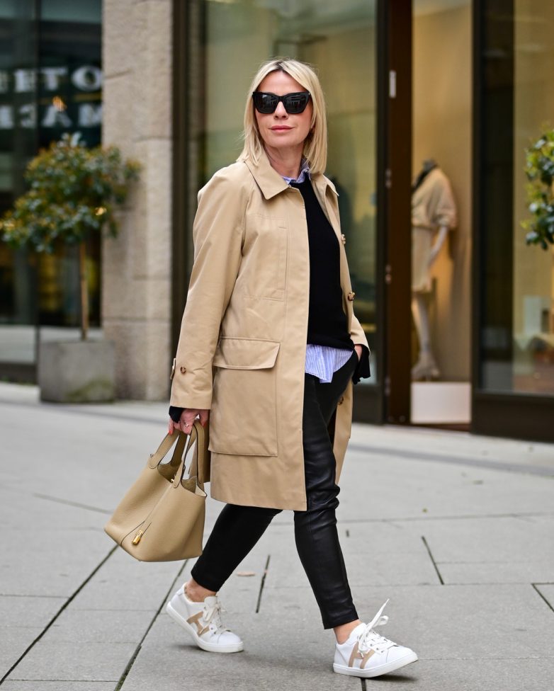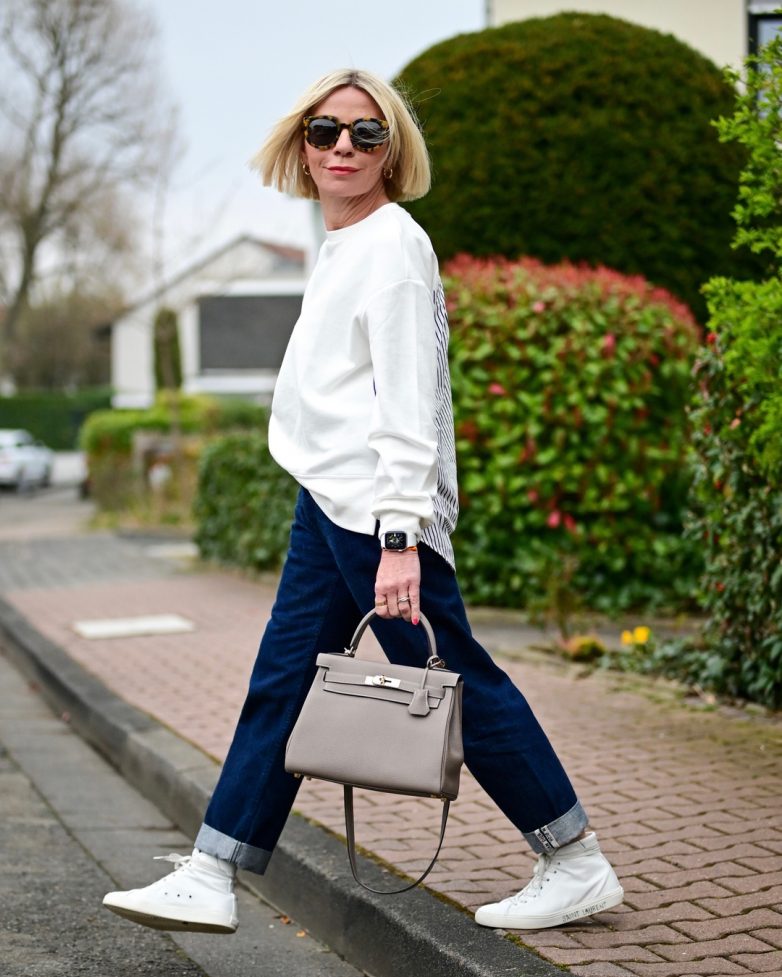 Выделяя в наряде талию, вы будете выглядеть женственно и привлекательно даже в спортивной обуви. Такой прием проверен временем и действует безотказно. Отлично с кроссовками и кедами смотрятся образы, дополненные модными джинсами и брюками с высокой посадкой. Вы визуально удлините ноги и ваш силуэт будет выглядеть стройнее и женственнее. Наряд из юбки с завышенной талией и рубашки придаст образу расслабленность и индивидуальный стиль, если сочетать их с классическими кроссовками.
