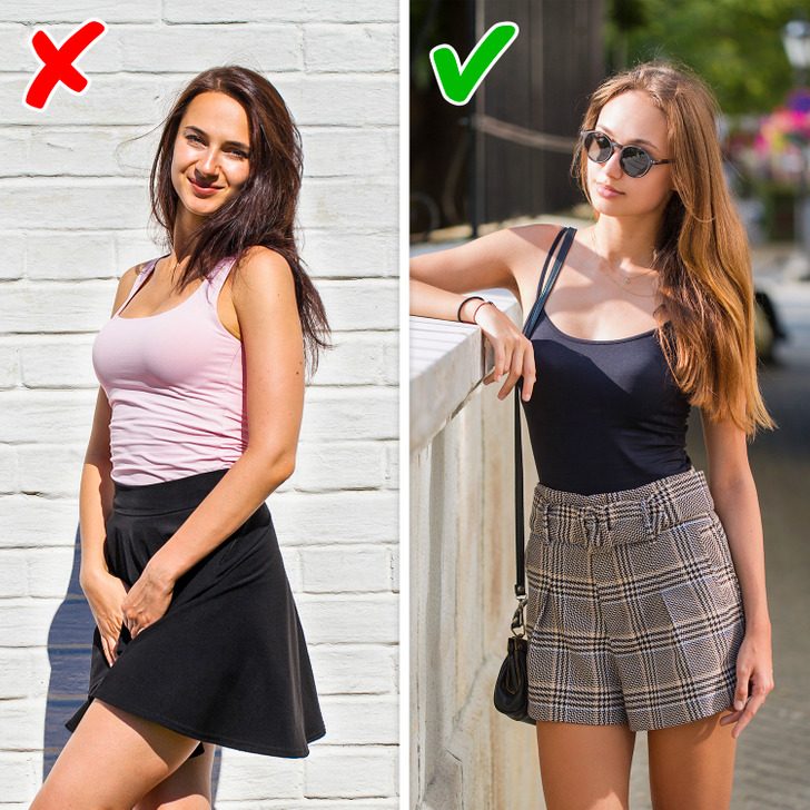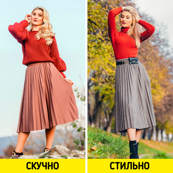 Лучше сочетать вещи разных объемов: обтягивающий верх и свободный низ или наоборот. Грамотно сбалансированный образ приковывает к себе больше взглядов даже без бросающихся в глаза ярких деталей.