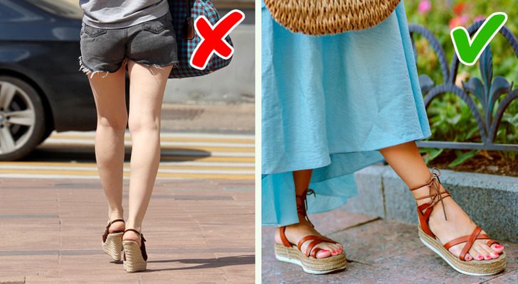 Но высокие шпильки или танкетки могут визуально исказить силуэт. Торс будет казаться излишне коротким, а нижние конечности — чересчур вытянутыми. Кеды, балетки или сандалии смотрятся значительно лучше с короткими нарядами. И не стоит тревожиться из-за длины ног.