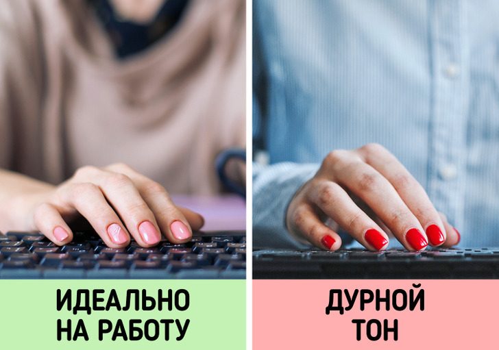 Работая в офисе, стоит внимательно относиться к своим ногтям: они не должны быть длинными, а оттенок лака — кричащим. Гораздо лучше выбрать среднюю или короткую длину и нейтральный цвет.