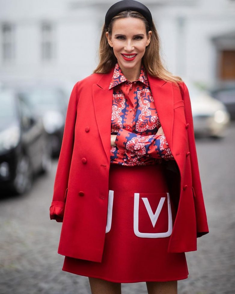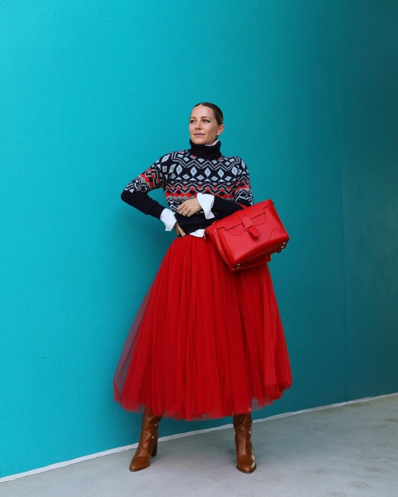 По модным правилам красный цвет должен присутствовать в монохроме либо сочетаться с более спокойной вещью. Лучше всего красный смотрится совместно с белым цветом. Поэтому для создания гармоничного и стильного лука выбирайте обычную белую кофту и самую роскошную красную юбку.
