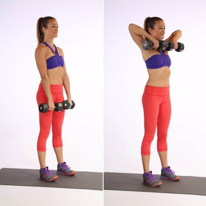 Выберите комфортный вес, прижмите руки к телу и медленно поднимайте их к плечам.