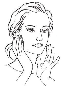 1. Поверхностью пальцев обеих рук погладьте переднюю часть лба, двигаясь снизу вверх, от бровей к волосам.2. Основаниями ладоней погладьте виски, двигаясь наискосок к ушам.