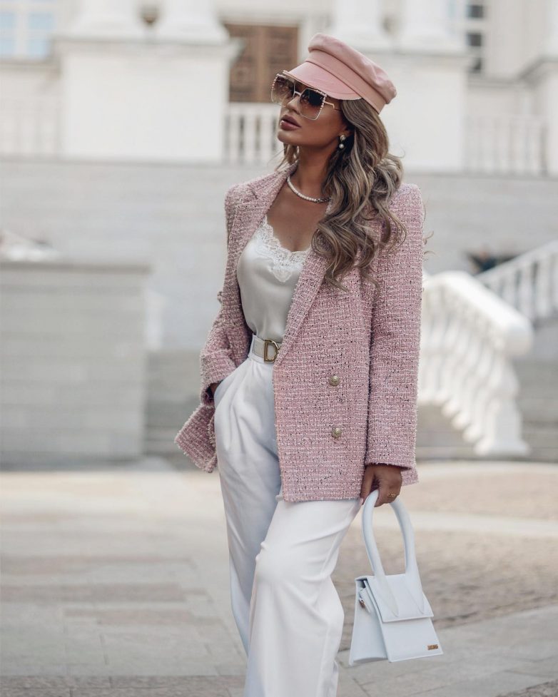 Брючные комплекты не теряют своей актуальности несмотря на жаркий сезон. Только стилисты советуют убрать в шкаф темные модели, а отдать предпочтение более свежим и интересным вариантам. Отлично смотрятся шикарные белые костюмы с классическими брюками. Также вы можете подобрать приятный сиреневый или другой пастельный тон для своего костюма.