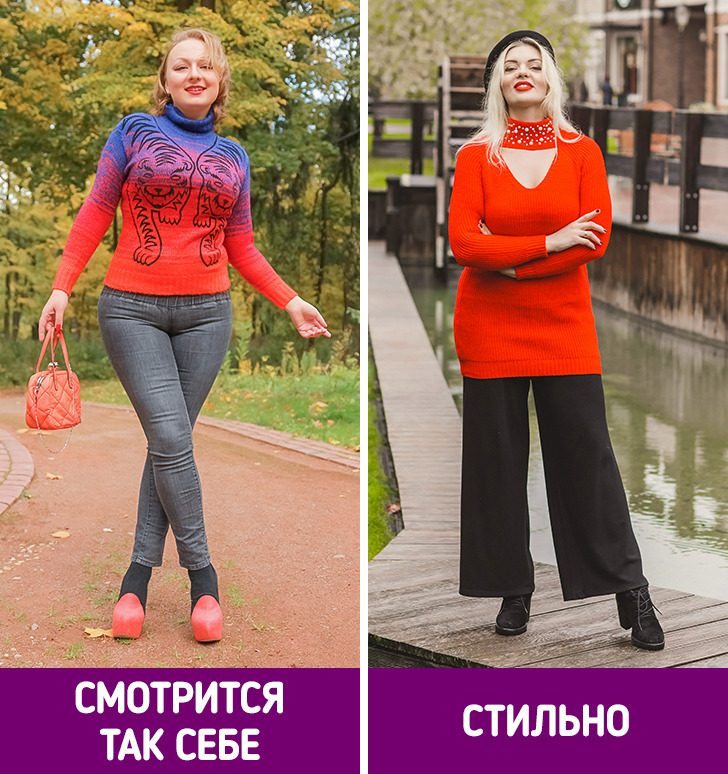 Чересчур обтягивающая одежда неподходящей длины всегда выглядит не очень. Если речь о ярком наряде, то он еще и подчеркнет недостатки фигуры. Чтобы цвет действительно стал изюминкой образа, стоит подбирать хорошо сидящую, но не обтягивающую одежду.