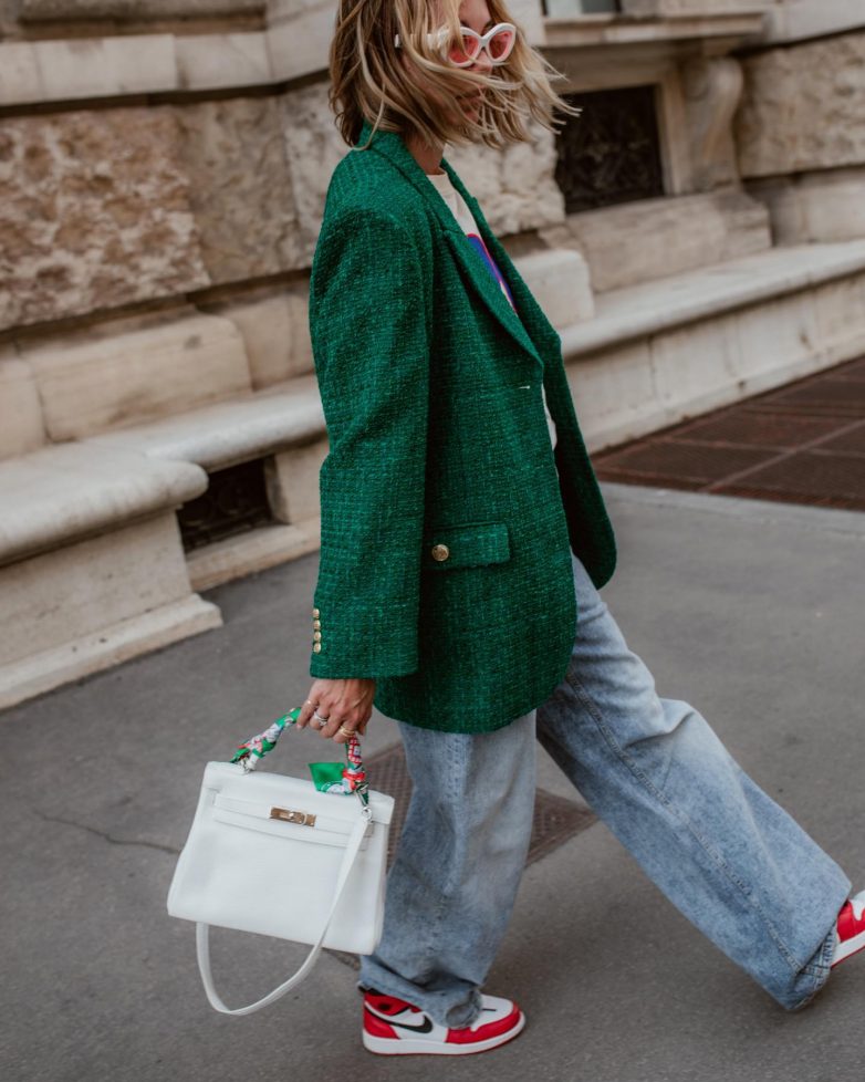 Так же, как и тренчкот, к образу с широкими джинсами можно выбрать классический пиджак. Подходят как модные модели в стиле оверсайз, так и теплые варианты из твида. Если хочется чуть больше яркости, тогда выбирайте пиджак в интересном принте или в красочном оформлении.