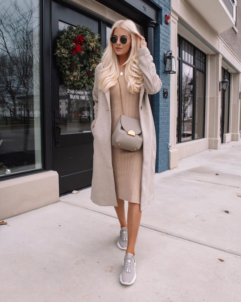 В этом сезоне очень актуален молодежный и современный стиль спорт-шик. Его основа – спортивные вещи с нотками классического стиля. Женщины совмещают спортивные костюмы с элегантными пальто и тренчами, выбирают модные кроссовки с нежными платьями. Чтобы образ полностью соответствовал модным трендам, то создайте лук в нюдовых оттенках.