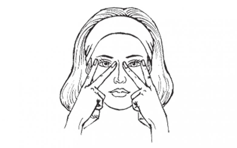 указательные и средние пальцы расположить на внешних уголках глаз;