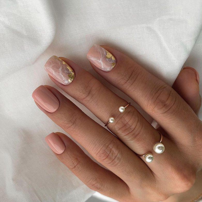 В текущем году актуален маникюр с имитацией природных камней. В частности, прекрасно смотрится мраморный дизайн. Повторяя естественную текстуру мрамора, он идеально подойдет к любому офисному наряду. Чтобы несколько украсить маникюр, можно выделить прожилки камня глиттером или блестящим лаком.
