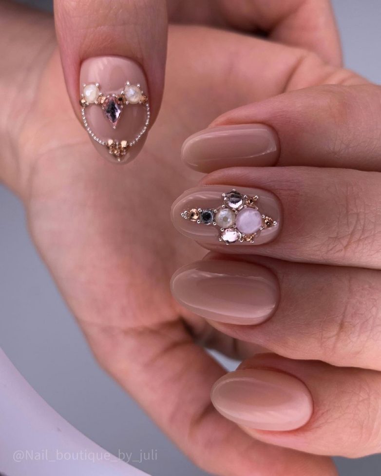Такой маникюр смотрится более, чем сдержанно. Чтобы он не навевал скуку, вполне уместно будет дополнить его оформлением акцентного ноготка рисунком, узором, втиркой или фольгой.