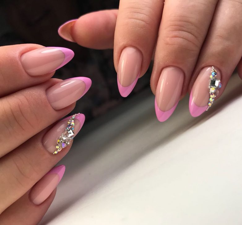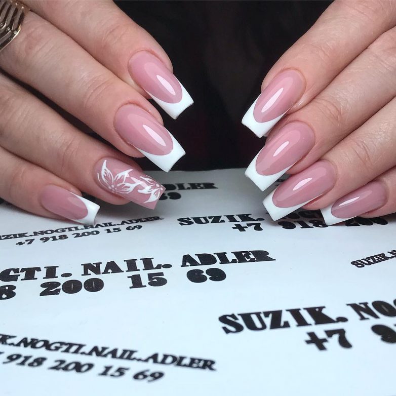 Непрокрашенные участки на ногтевых пластинах – это и есть дизайн негативное пространство. Такой маникюр прекрасно сочетается с геометрией, лунным маникюром, френчем. Вполне уместно декорировать его небольшими стразиками, миниатюрными изображениями в флористической тематике.