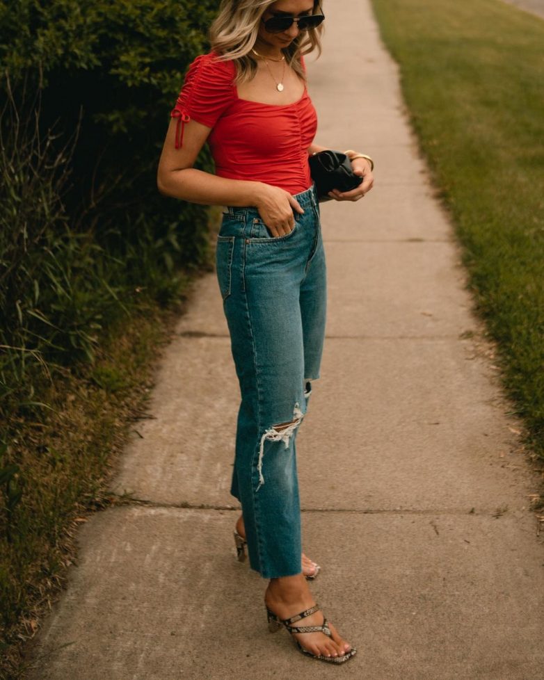 В 40-50 лет мэтры мира моды предлагают женщинам обращать внимание на фасоны джинс: прямые, с завышенные талией, укороченные, рваные. Точно исключить нужно обтягивающие и слишком декоративные модели. В остальном вы можете проявлять свою фантазию на максимум. С джинсами можно собирать деловые сеты, если включить лодочки и пиджак, повседневные – с сандалиями или шлепками и футболкой, романтичные – с интересной блузкой.