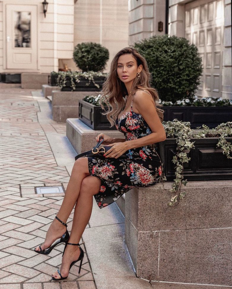 Аккуратное миди платье на бретельках в цветочном принте создает очень нежный образ женщины. В таком платье дама будет выглядеть сногсшибательно стильно и невероятно страстно. Благодаря струящейся ткани изделия наряд будет развиваться на ветру, подчеркивая главные достоинства женского тела. К такому луку выбирайте такие же модные открытые босоножки на высоком каблуке, это позволит закончить образ красивой кокетки.