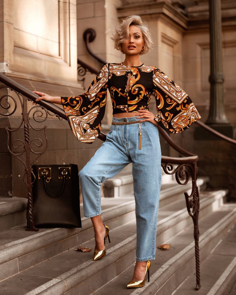 Несмотря на то что джинсы считаются будничной одеждой, с ними можно создавать очень страстные и завораживающие образы. Выберите стильные укороченные зауженные джинсы и добавьте к ним ярко-красную блузку с открытыми плечами и такие же красочные туфли на каблуке, милую бежевую сумочку и обаятельный аксессуар – модные солнцезащитные очки, в итоге модный лук seksуальной женщины будет готов.