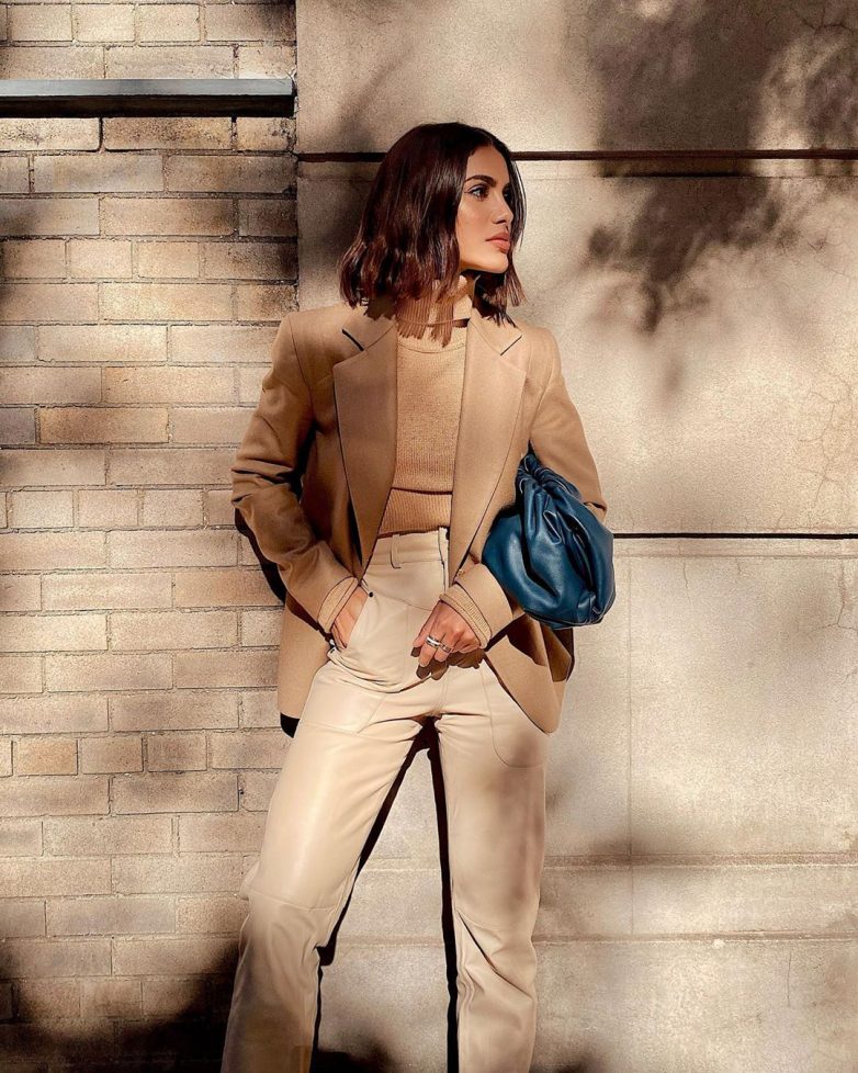 Для рабочего стиля обязательно стоит приобрести брючный стильный костюм в нюдовом цвете. Под пиджак можно подобрать как обычную блузку, так и трикотажные водолазки, майки или неброскую футболку.