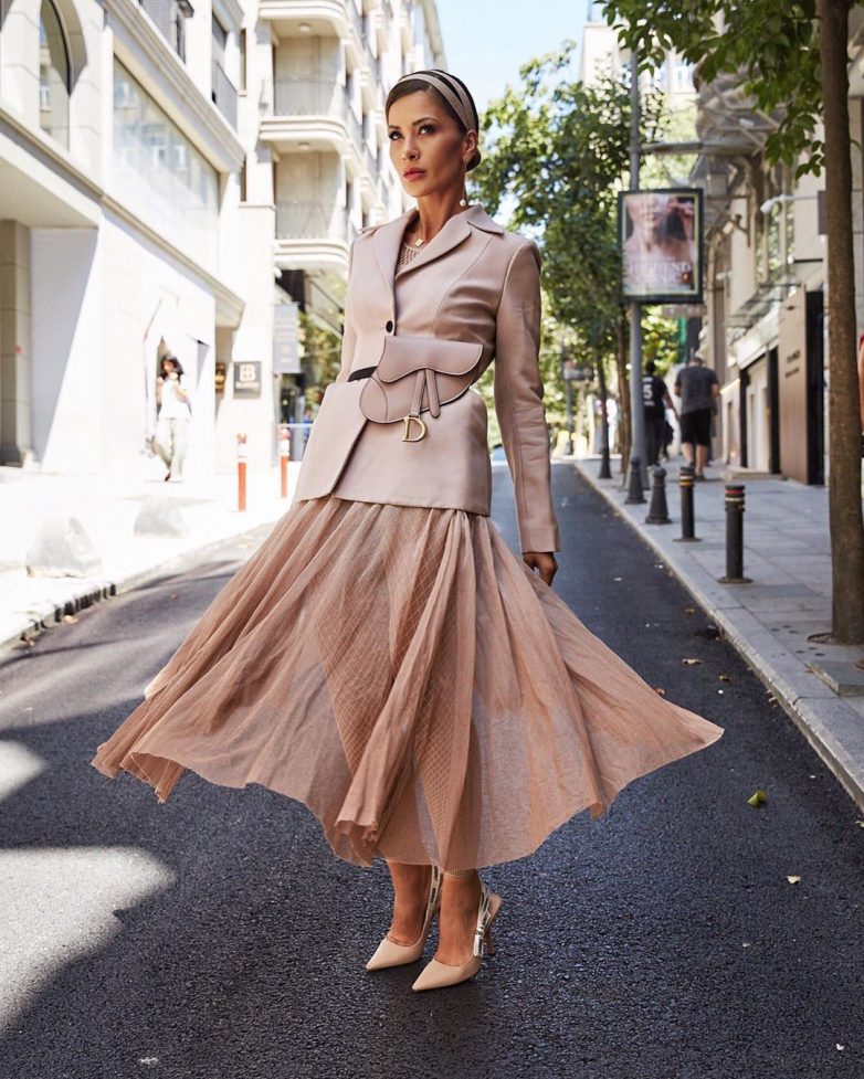 Комплект из свободного кроя шифоновой юбки и строгого пиджака цвета пыльной розы невероятно элегантный наряд. Поясная сумочка подчеркивает изящность талии.