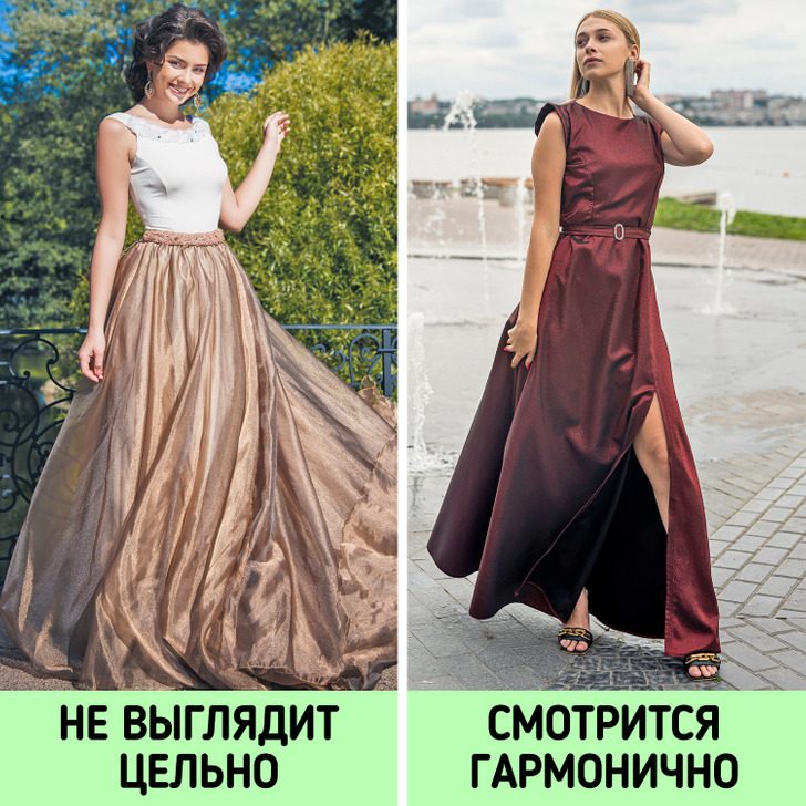 Стилисты рекомендуют не останавливать свой выбор на платьях с резким цветовым контрастом между верхней и нижней частями. Подобное сочетание может выглядеть как 2 разных платья, сшитых в одно. А это упростит и «удешевит» наряд.