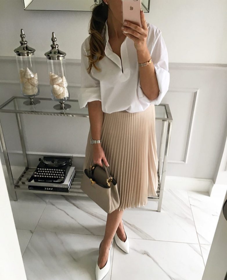 Строгий и лаконичный образ можно составить, если выбрать плиссированную юбку миди и приправить ее белой рубашкой, туфлями, а также небольшой сумкой в руку.