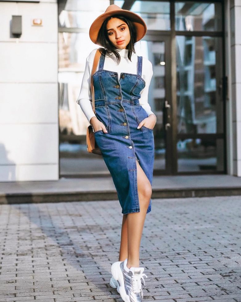 Поклонницы спортивного стиля удачно сочетают джинсовый сарафан с не широкими бретелями и сквозной застежкой с водолазкой и металлизированными кроссовками. Элегантная шляпка добавит образу романтизм и женственность.