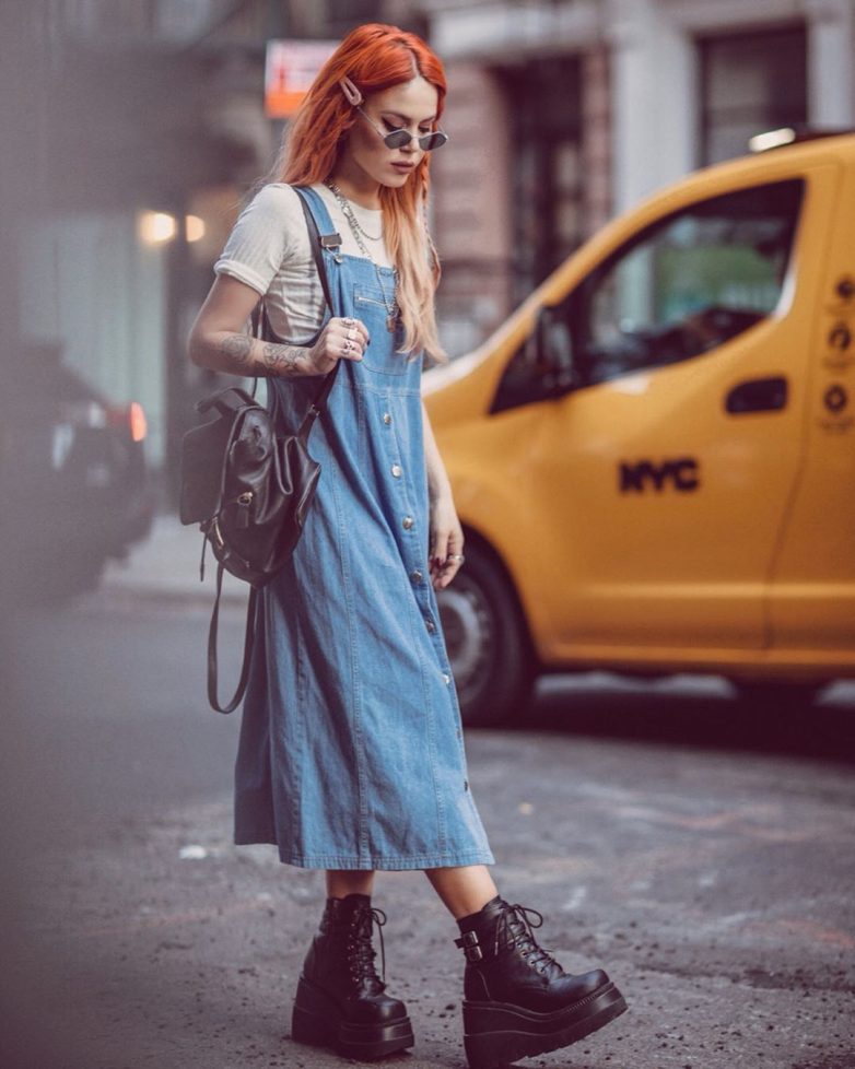 Выбором многих молодых девушек является джинсовый сарафан свободного кроя длины миди. Украшает его крупный накладной карман на груди с молнией. Светлая футболка и удобные ботинки на платформе удачно дополнят уличный стиль. Завершающим штрихом в создании модного образа будет кожаная сумка среднего размера на длинном ремешке и серебряные цепочки.