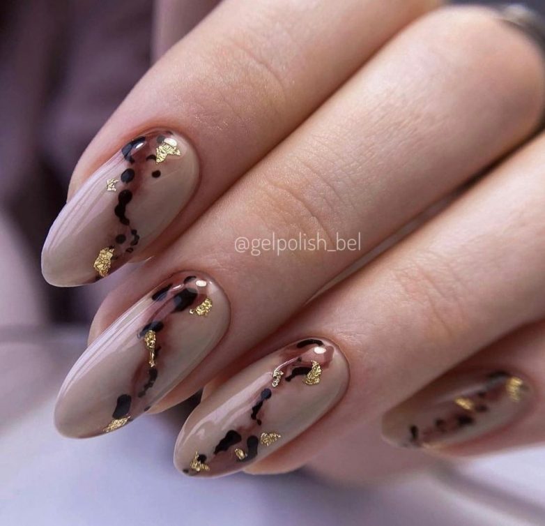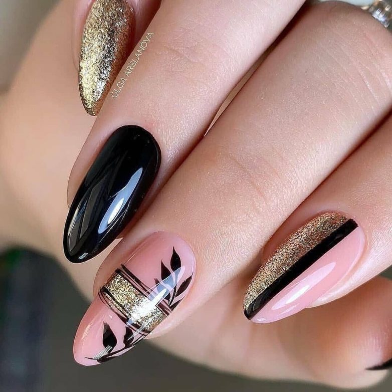 Аккуратные миндальные ноготки бесподобно смотрятся с поталью (жатой золотой фольгой), золотистой втиркой, полосками и стразами золотистого цвета. В нынешнем году такой маникюр вполне уместен даже в повседневной жизни, а не только на праздничных мероприятиях. Особо эффектно смотрится золотой декор в дизайне «негативное пространство».
