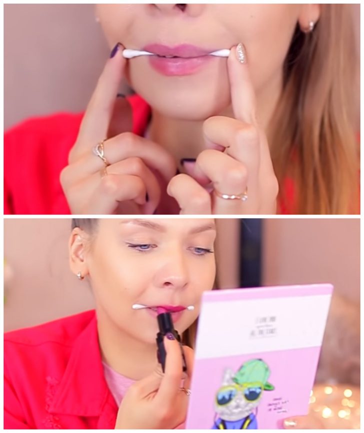Чтобы помада не забивалась в уголках рта, поместите ватную палочку между зубами.