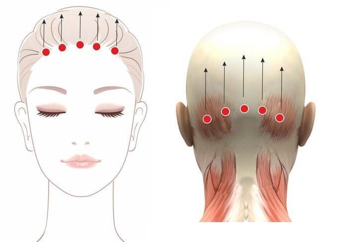 Исходное положение: сидя или стоя, позвоночник выпрямлен. Аккуратно поставьте подушечки пальцев правой руки на линию роста волос на лбу (см. точки на картинке). Подушечки пальцев левой руки распределите по линии затылочного брюшка мышцы — над затылочным выступом (пошебуршите в волосах, пальцы сами найдут правильное положение). Для левшей – поменяйте руки.Выполнение: 1. Легко пульсируйте пальцами в ритме сердца в направлении вверх, к макушке, навстречу друг другу, мысленно посылая мышцам приказ двигаться (направление указано на картинке стрелками). – 30 сек.