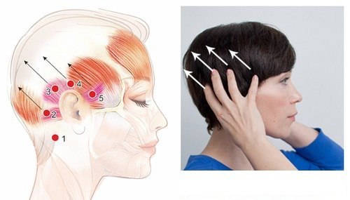 2. Опустите руки, стряхните с них напряжение. Без помощи рук, одним только мысленным приказом постарайтесь сдвинуть височные мышцы в указанном направлении. Пульсируйте мышцами еще 30 сек. Расслабьтесь.
