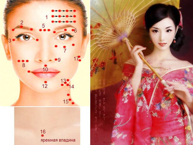 Для выполнения омолаживающего массажа используются следующие группы и отдельные точки воздействия: