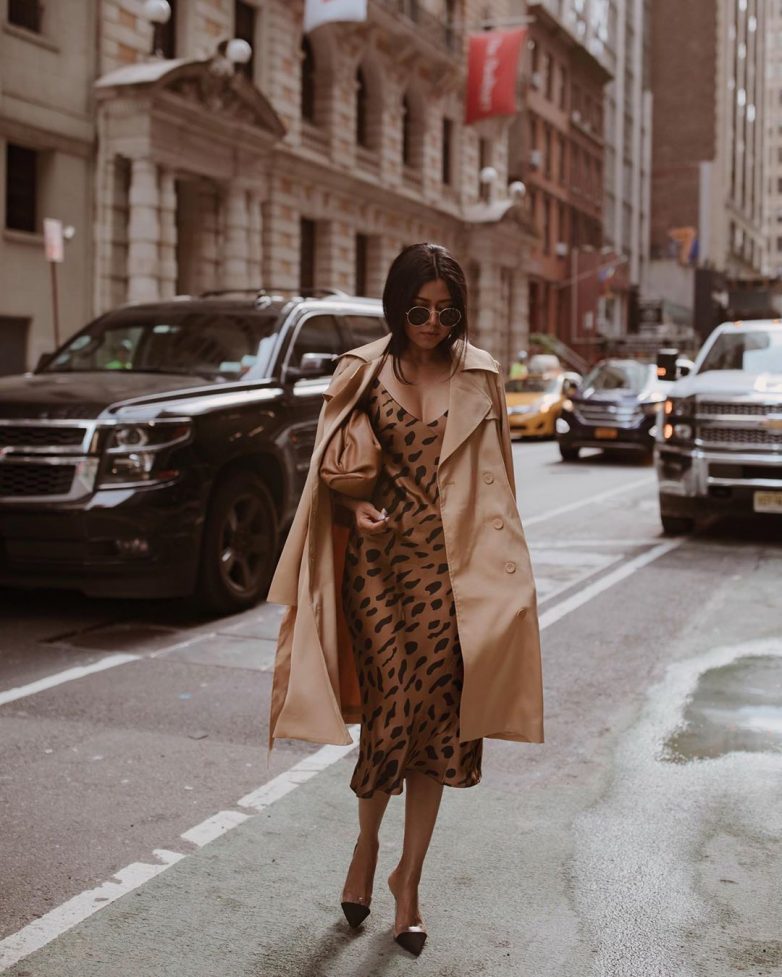 Трендовый утонченный бельевой стиль отлично впишется в гармоничный осенний лук. Платье длины миди в интересном животном принте бельевого стиля можно дополнить изящным тренчем или плащом в том же бежевом оттенке. Шпильки закончат самый обворожительный и легкий лук женщины.