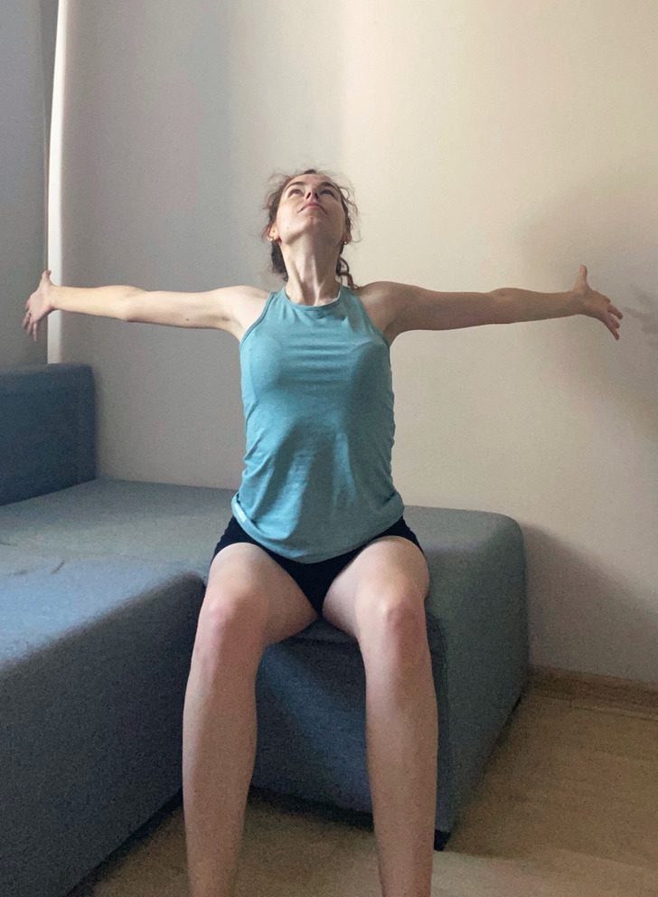 Сядьте на край стула. Выпрямите спину, опустите плечи, вытяните шею. Разведите руки в стороны и выпрямите их. Растопырьте пальцы (вы можете почувствовать легкое покалывание).
