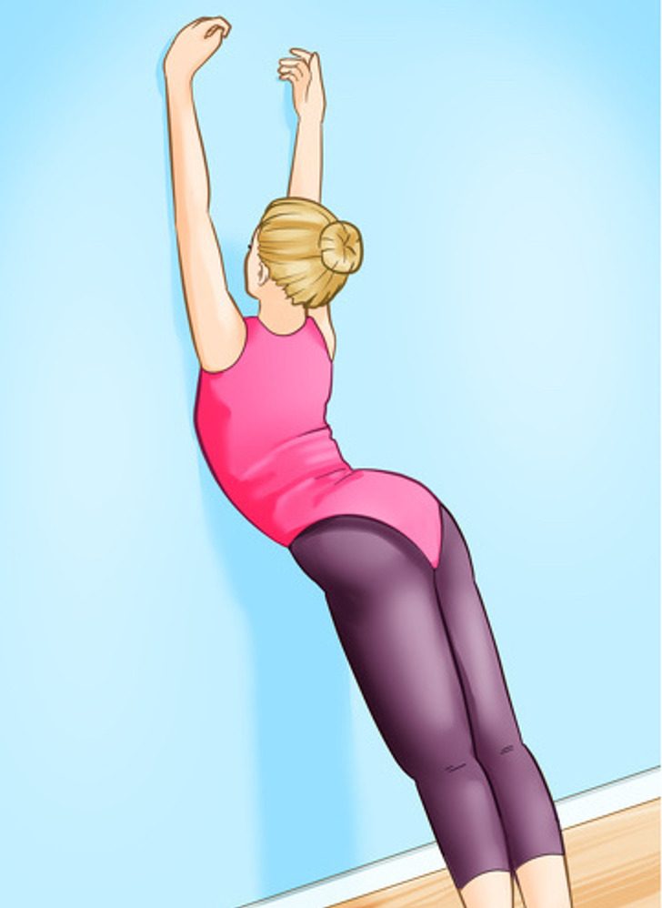 Встаньте лицом к стене. Стопы параллельны друг другу и направлены прямо вперед. Положите ладони на стену на ширине плеч. Отведите ноги назад, таз наклоните вперед, чтобы прогнуть нижнюю часть спины. Держите локти прямыми и позвольте верхней части тела опуститься между руками. Задержитесь на минуту.