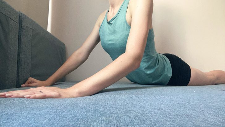 Опуститесь на колени. Соедините ладони и протяните их в сторону так, чтобы рука, оказавшаяся снизу, легла на пол. Спокойно дышите. Сделайте то же самое в другую сторону.