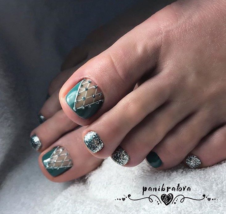 Зеленый педикюр с серебром