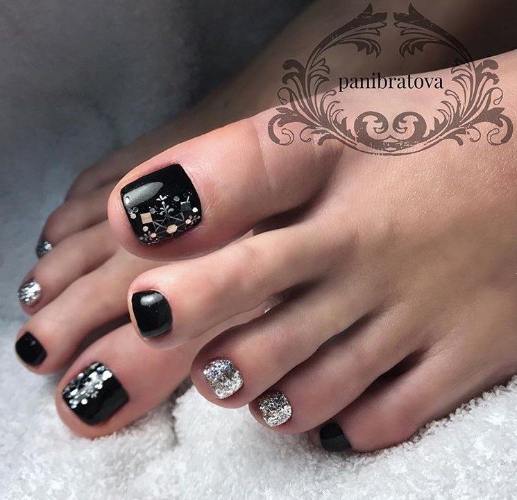 Черный педикюр с серебром