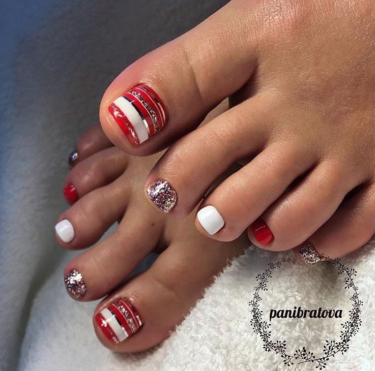 Попробуйте поэкспериментировать со своим мастером и найти свой идеальный вариант красно-серебряного педикюра.