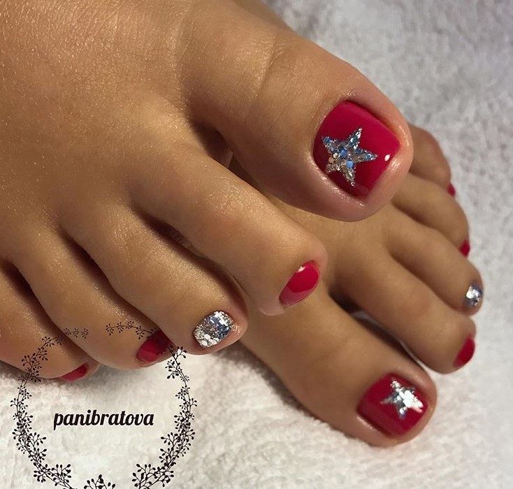 Красный педикюр с серебром