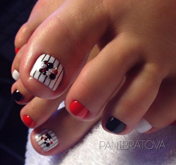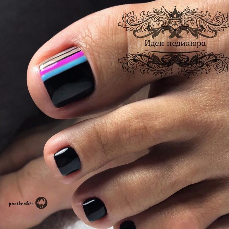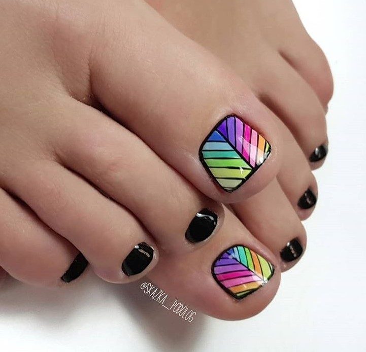 Радужные полоски – это идеальный педикюр для лета или отпуска. Обычно основной фон выбирают в базовых цветах: белый или черный, так как они позволяют выделить разноцветный дизайн. Полоски можно сделать на всех ногтях в вертикальном положении или добавить несколько штук на один большой пальчик.