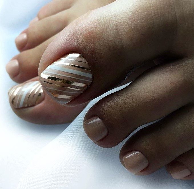 Полоски бывают разные. Можно выбрать вертикальные, горизонтальные, косые, тонкие или толстые. Также педикюр с полосками позволяет сделать акцент на одном ногте или оформить все пальчики в одном дизайне. Преимущество идеи заключается в том, что ее можно исполнять совершенно в любой цветовой гамме.