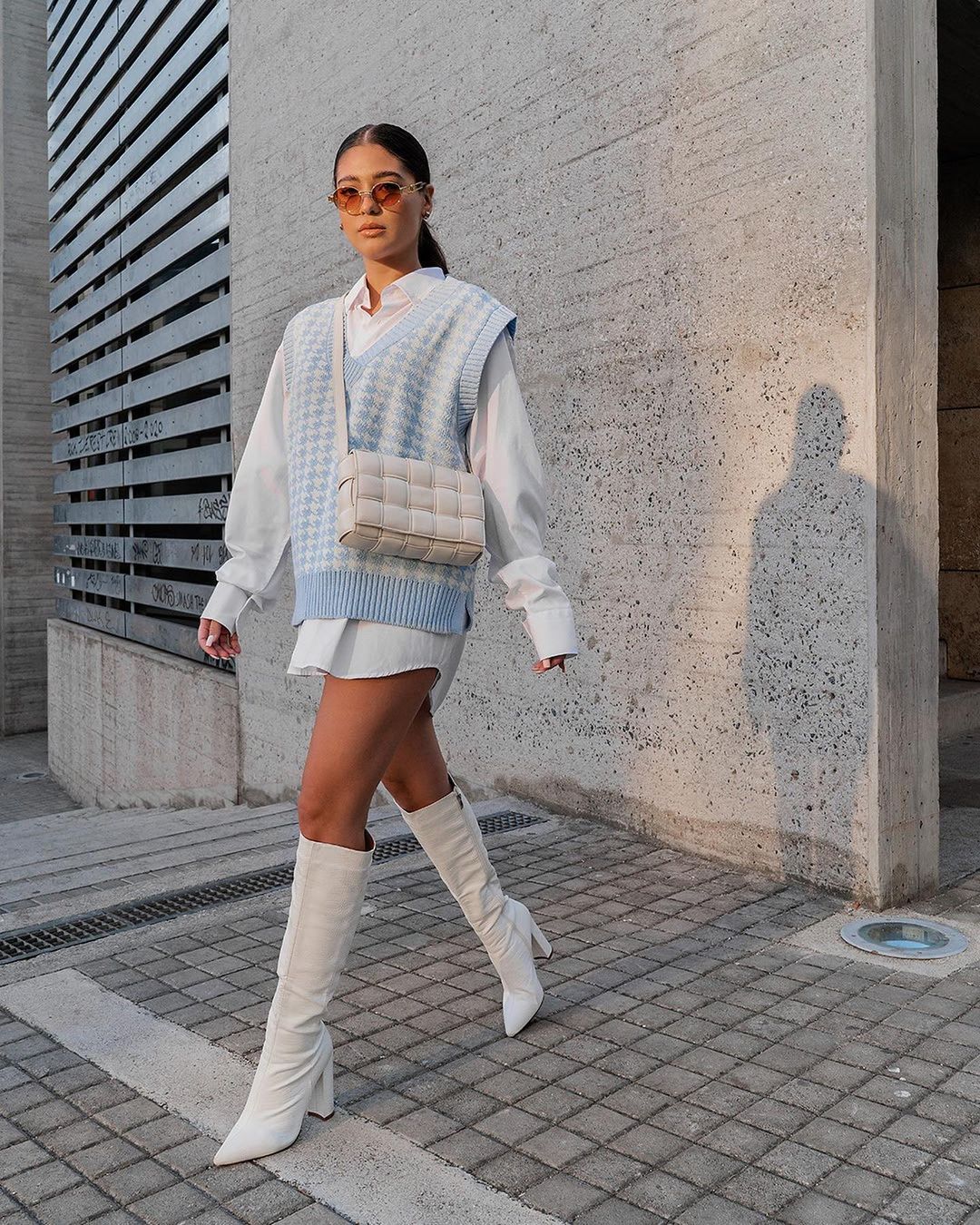 Трендовая многослойностьСочетание рубашки белого цвета, серого свитера и клетчатого жакета актуально в этом сезоне. Многослойность не позволит замерзнуть в сырую погоду.