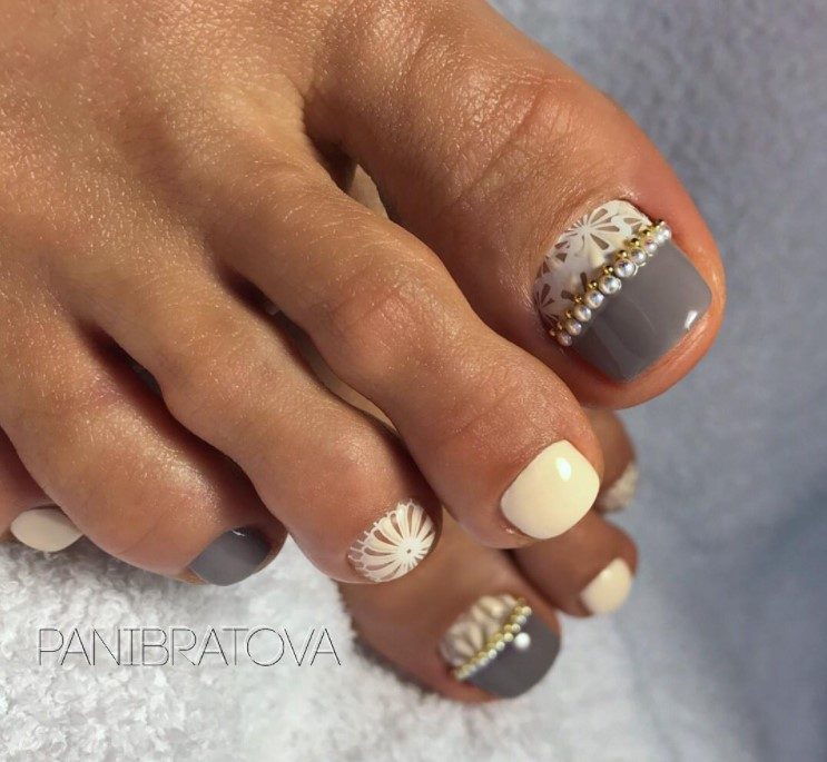 Несмотря на то что серый оттенок не слишком выразительный, при желании с ним можно создавать очень яркие и торжественные идеи дизайна. В зависимости от стиля женщины в серый педикюр добавляют розовый, белый, желтый и другие приятные тона, а также украшают блестящими стразами, блестками и оригинальными рисунками.