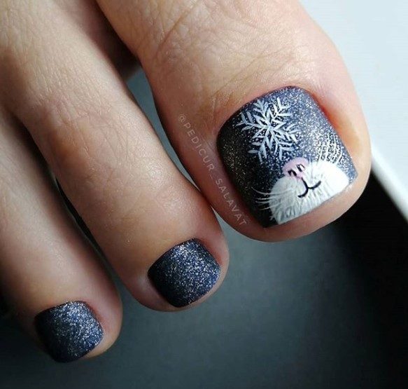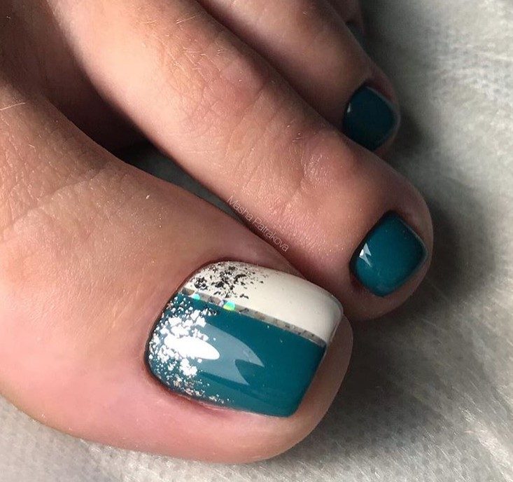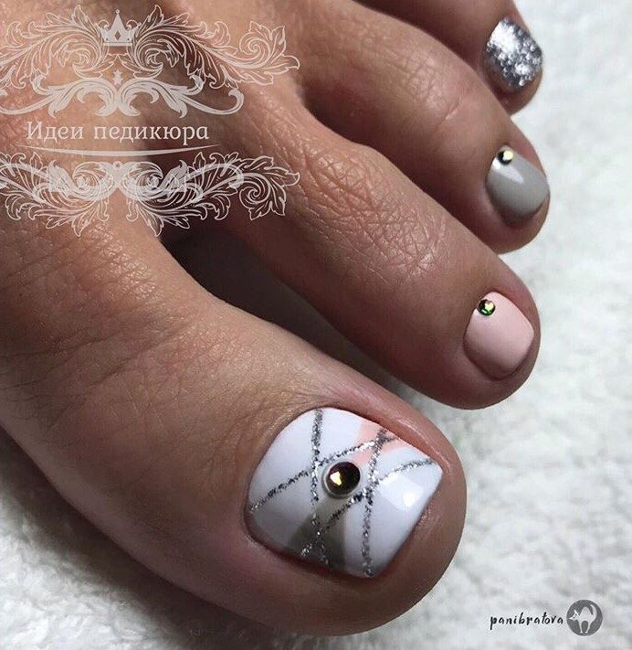 Оттенок серого цвета гармонично сочетается с серебряным блеском. Соответственно можно выбрать трендовый педикюр геометрия и добавить серебряные блестки на некоторые линии. Для создания интересного контраста мастера нейл-арта добавляют черный цвет в педикюр.