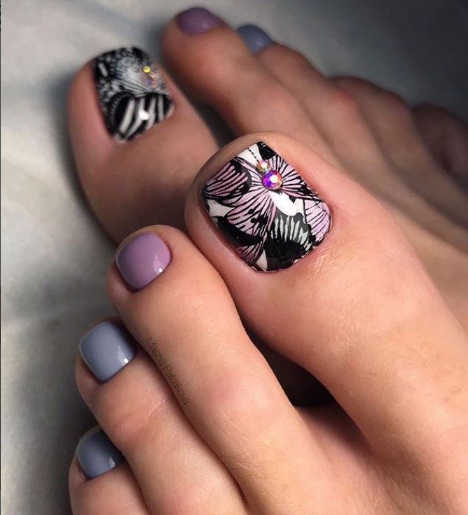 Для летнего сезона также используются серые цвета лака. К примеру, на большом пальчике рисуют объемный эскиз бабочки или цветка, а другие ногти оформляют в серый, грязно-розовый и другие тона.