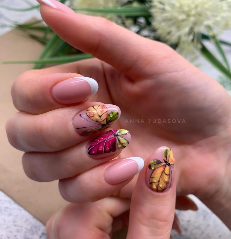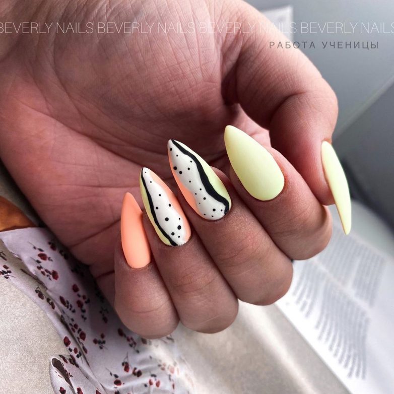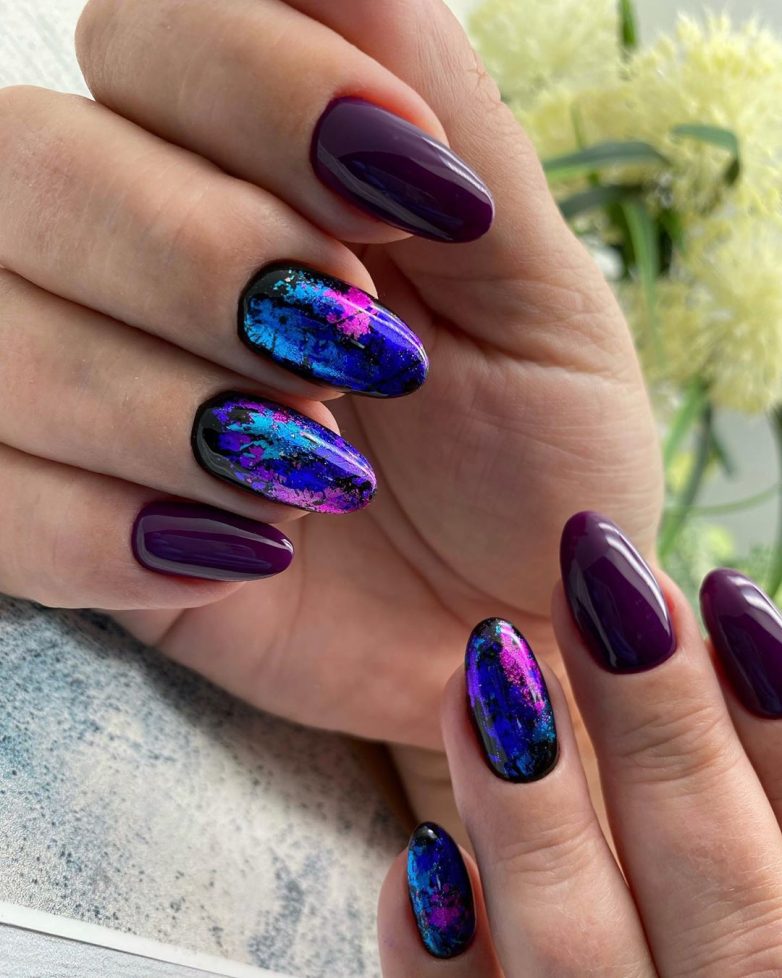 Осенние листья и подобный тематический дизайн – это логичные варианты маникюра. Если хочется чего-то необычного и стильного, тогда лучше всего сделать трендовый маникюр с абстракцией. Здесь уместны все цвета радуги, геометрия, паутинка, узоры и разнообразные текстуры, одним словом, можно реализовать даже самую яркую вашу фантазию.