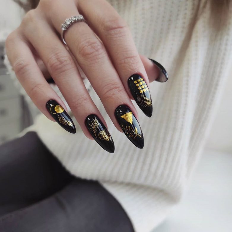 Осень всегда ассоциируется с золотыми красками, поэтому маникюр с драгоценными штрихами будет, как никогда, в моде. Золотая фольга или блестки отлично смотрятся на ногтях, украшая их и создавая самый шикарный образ модницы. Из золота можно рисовать листочки, корону, веточки.