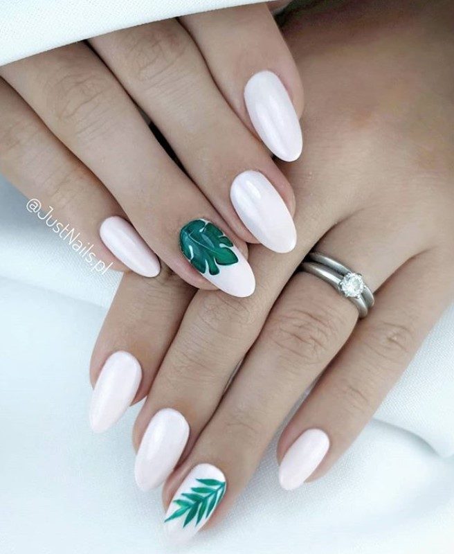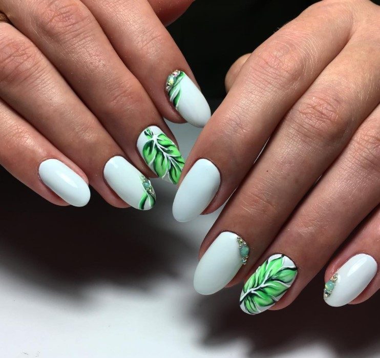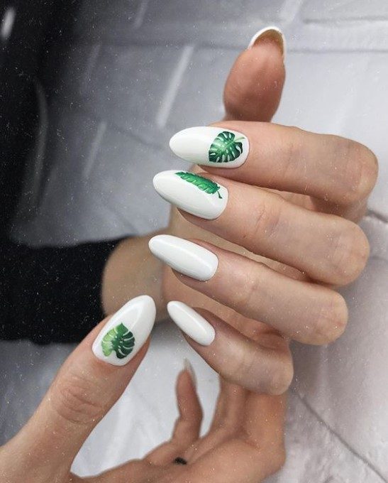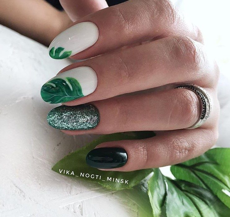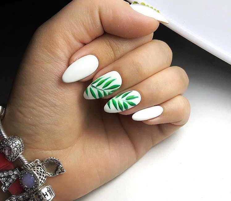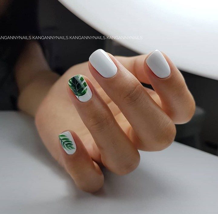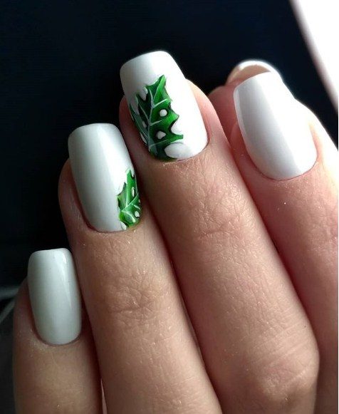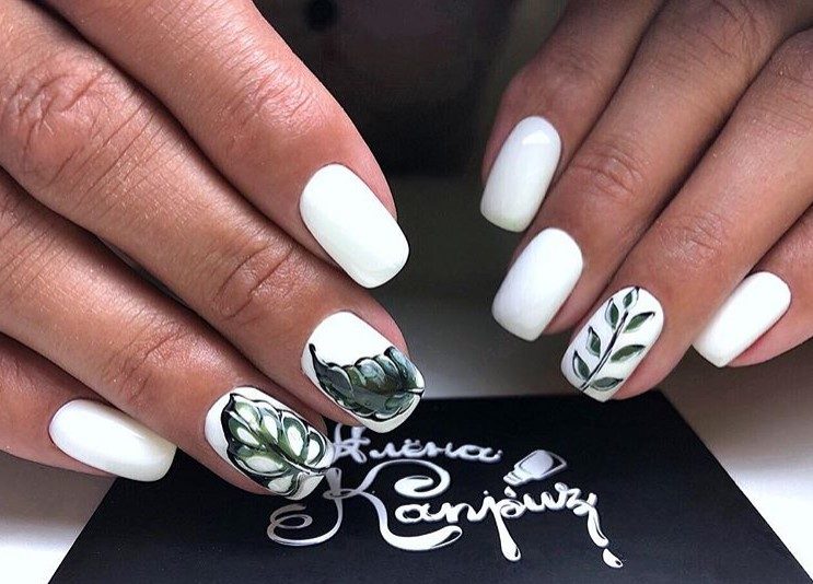 Зеленый цвет эффектно смотрится на белоснежном фоне. На монохромных ногтях лист выглядит, как произведение искусства. Сочетание разных оттенков дополняет выразительность. Чтобы не перегружать образ, принт рисуют на ногте одного пальца.